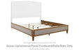 This queen upholstered panel footboard with slats is made with solid wood frames, an upholstered foam cushion and engineered wood slats. Pairs with other items in the series to make a bed kit.