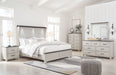 Casual Lifestyle Design. Made with solid Acacia wood, Cherry veneer and MDF substrates. Stylish 2-tone finish featuring glazed light gray paint with clean brown cherry-stained tops. Small handmade distressing marks such as rounded off corners and brushed finish effect while the top features a thick planked look. Cases feature spacious inset drawers with fully finished interiors, metal ball bearing side glides and metal bar pulls with an aged iron finish. Top drawers have black felt bottoms. The panel bed features an upper gallery shelf with LED reading lights conveniently located underneath. The two drawer nightstand includes a 110V power supply with dual USB charging ports.