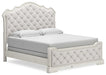 Add a touch of romance to your home with this California king upholstered bed. The antiqued white painted finish and serpentine-shaped silhouette details are the picture of easy elegance. Indulge your love of luxury with decadent button-tufted cushioning from head to toe.