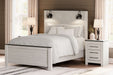 This queen panel bed harmonizes effortlessly with your farmhouse-chic approach to contemporary style. Curate your space with the charmingly classic look of its white rustic finish. Faux metal banding with nailhead corner accents infuses delightful vintage character to the clean-lined design. Polishing off the piece, matte black sconce lights merge simply stunning form and function.