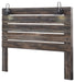 When merged in just the right way, rustic and industrial styles can make one happy marriage. Case in point: this king panel headboard. A refined take on barn board beauty, its complex, replicated wood grain showcases hints of burnt orange and teal tones for a sense of weatherworn authenticity. Love to read in bed? You’re sure to find the pair of retro-chic light sconces and USB plug-ins on the open-slat style headboard such a bright idea.