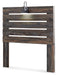 When merged in just the right way, rustic and industrial styles can make one happy marriage. Case in point: this full panel headboard. A refined take on barn board beauty, its complex, replicated wood grain showcases hints of burnt orange and teal tones for a sense of weatherworn authenticity. Love to read in bed? You’re sure to find the retro-chic light sconce and USB plug-ins on the open-slat style headboard such a bright idea.