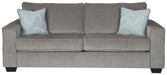 If style is the question, then this strking sofa sleeper is the answer. Sporting clean lines and sleek track arms, the decidedly contemporary profile is enhanced with plump cushioning and a chenille-feel upholstery that's so pleasing to the touch. Sure to play well with so many color schemes, this sofa sleeper in richly neutral alloy includes a pair of understated floral pattern pillows for fashionably fresh appeal. Pull-out queen mattress in quality memory foam comfortably accommodates overnight guests.