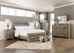 Warm gray sophisticated vintage finish with white wax effect over replicated oak grain. Tall generously scaled cases with wide pilaster, finished off with gently curved foot. Large dark pewter color handles with an aged appearance accent cases. Modern styled deep panel bed enhanced with horizontal pocket details. Side roller glides for smooth operating drawers. Queen (67) and king/cal king (68) headboards can attach to a bolt-on metal bed frame B100-31 or B100-66 respectively. Safety is a top priority, clothing storage units are designed to meet the most current standard for stability, ASTM F 2057 (ASTM International). Drawers extend out to accommodate maximum access to drawer interior while maintaining safety.